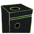 Das Zelt wird von stabilen, grünen Metallstangen und Kunststoffeckverbindern getragen, die eine schnelle und werkzeugfreie Montage ermöglichen. Die doppelwandigen Zugänge mit Zugband bieten flexible Optionen für die Installation von Belüftungssystemen und Zubehör. Sechs Belüftungsklappen mit Netzeinsätzen regulieren den Luftaustausch und halten Schädlinge fern.
